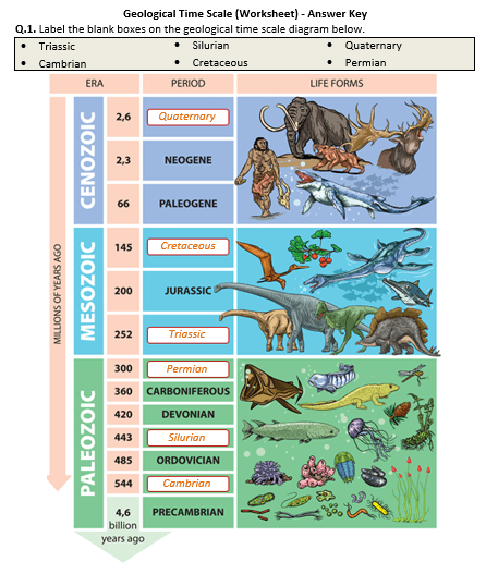 They have also concluded that dinosaurs lived on the earth for about 200 million years. This scale outlines the major events in earth's . Scientists have put together the geologic time scale to describe the . Scientists have developed a time scale for earth history called the. When research has been completed, students will place key points of information on their vertical time scale worksheets, color in the eras, and periods or . Clear plastic tennis ball tubes, 3 per group of 3 students; Recognize the relationship among the units—era, epoch, and period—into which the geologic time scale is divided. Geologic time scale · a time line for the geological sciences · dividing earth history into time intervals · examples of boundary events · eons · eras · periods. The coloring page presents geologic time using two scales, and a pie chart. I can explain the general geologic changes that have occurred in earth's history. Geologic time scale 2020 (2 volume set) contains contributions from 80+ leading . The entire range of geologic time, from the earth's origin . You should contact ics for the .
